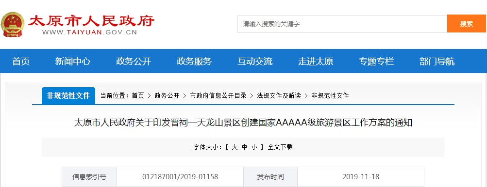 山西日报新媒体综合报道:11月18日,太原市人民政府网站发布《晋祠——天龙山景区创建国家 AAAAA 级旅游景区工作方案》。太原市将以晋祠博物馆、晋祠公园、天龙山景区为核心,全面提高景区品质、服务质量和游客满意度,把晋祠——天龙山景区建成国家5A级旅游景区,打造国内一流、世界知名、游客向往的旅游目的地。一