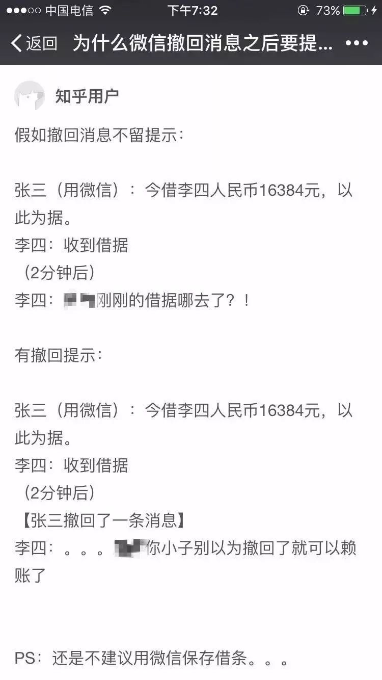 既然撤回信息给用户提供了一种后悔药,为啥吃完后还要留下“某某撤回了一条消息“的提示呢?