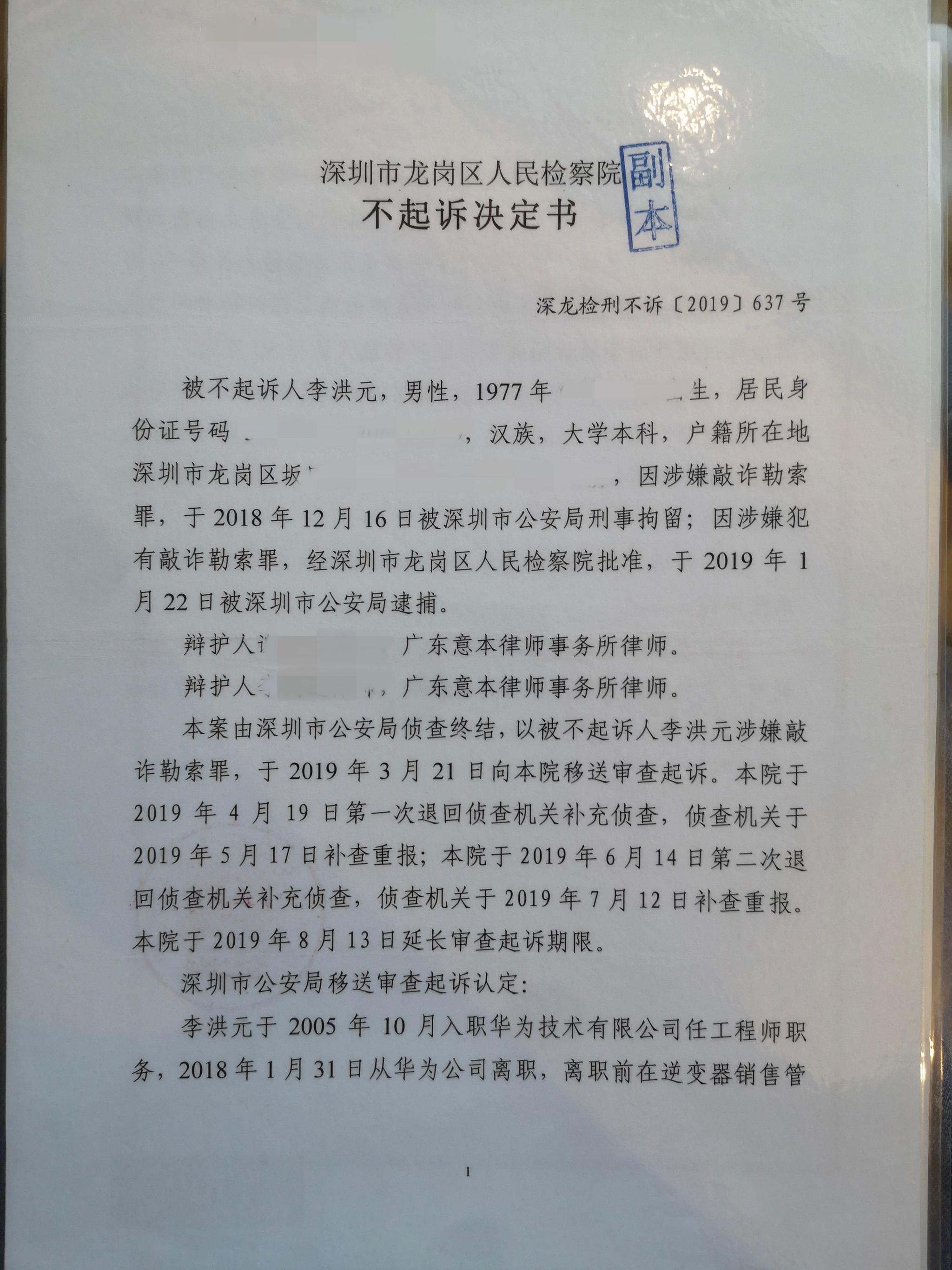 拿到补偿的9个月后,李洪元被深圳市公安机关刑拘、逮捕,最终被深圳市龙岗区检察院决定不起诉。在被羁押的251天里,他先后涉嫌职务侵占、侵犯商业秘密、敲诈勒索三个罪名。从相关法律文书和李洪元辩护律师的调查结果来看,李洪元被抓源于华为的控告。