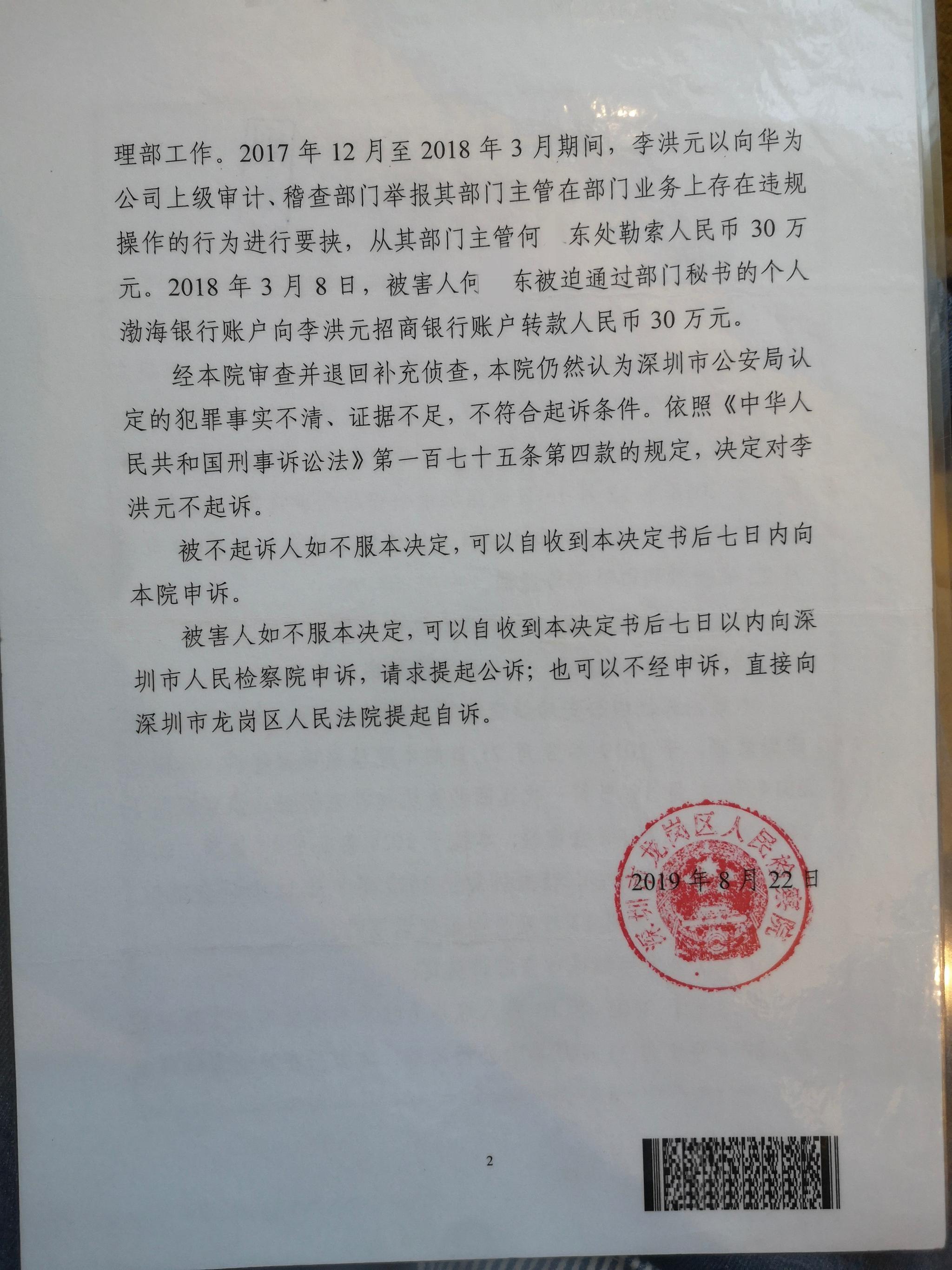 但拿到补偿的9个月后,李洪元被深圳市公安机关刑拘、逮捕,最终被深圳市龙岗区检察院决定不起诉。在被羁押的251天里,他先后涉嫌职务侵占、侵犯商业秘密、敲诈勒索三个罪名。从相关法律文书和李洪元辩护律师的调查结果来看,李洪元被抓源于华为的控告。