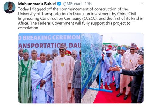 布哈里最后还感谢了中土集团。他在推文中写道,“我们感谢投资者——中国土木工程集团有限公司;卡齐纳州政府会迅速为大学提供土地;交通部也会支持这一举措。我们将继续寻求这种类型的伙伴关系,为尼日利亚带来发展。”