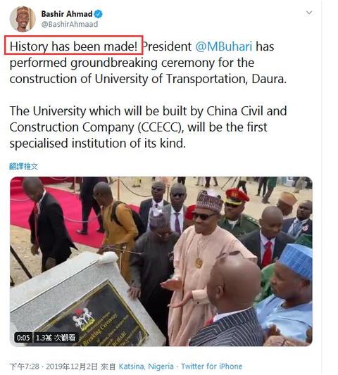 布哈里的私人助理当天也在推特上发布中企承建项目举行奠基仪式的消息,称“创造了历史!”