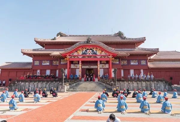 冲绳民众在首里城正殿前举行传统仪式(图源:冲绳时报)