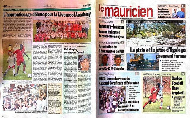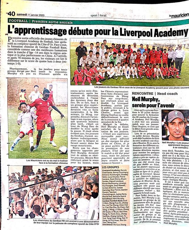 这边,上海崇明根宝足球基地2006-2008年龄段的小将,个头不高;那边,是欧冠冠军利物浦在毛里求斯的青训学院队,身高马大。这场中毛少年足球友谊赛,最终以根宝基地4比2赢得结果和场面落幕。比赛吸引毛里求斯国家电视台进行转播,毛里求斯国家日报也于第二天在头版突出位置、体育新闻版给予大篇幅报道。