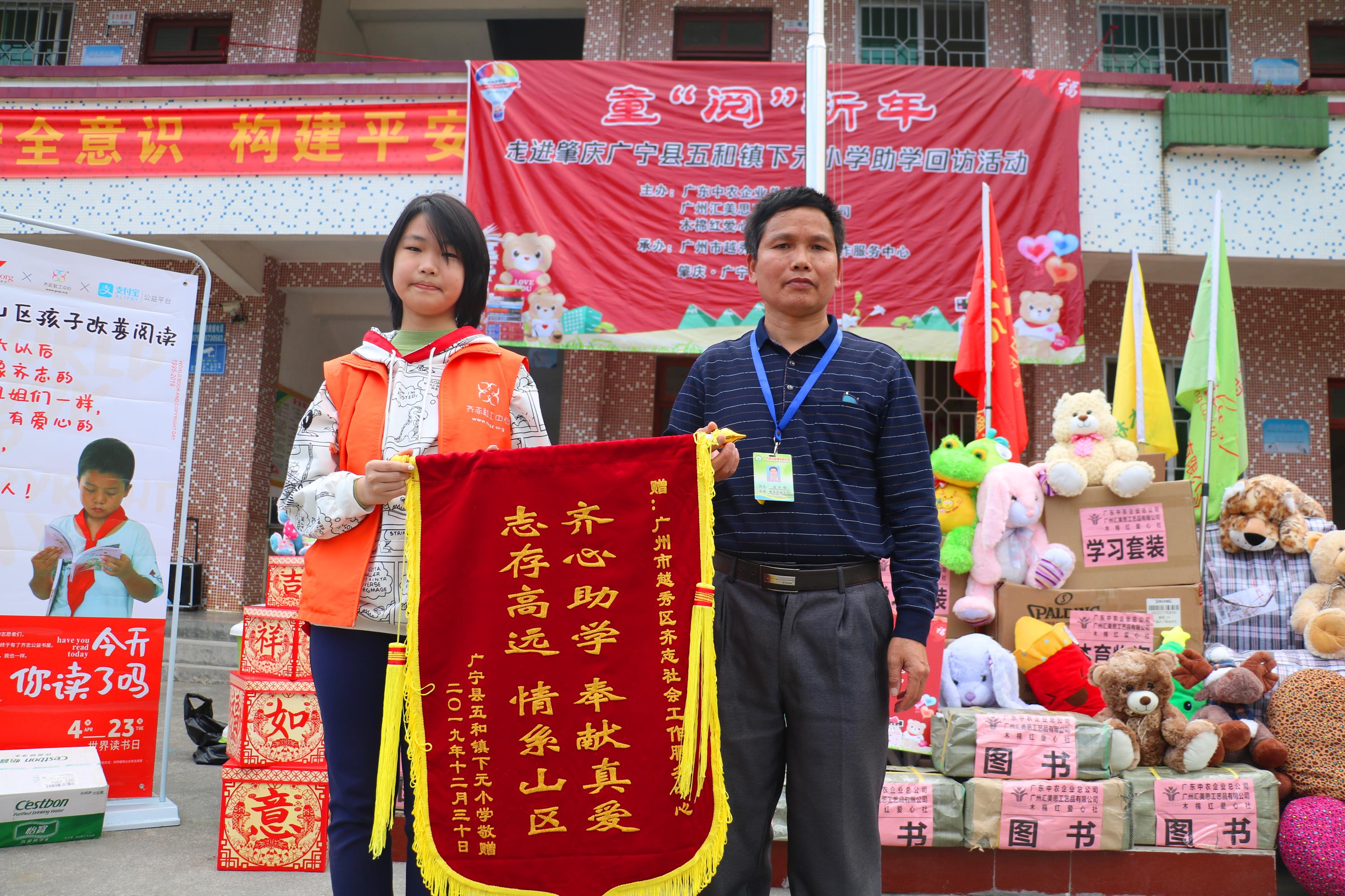 本次助学回访活动得到了五和镇政府的重视,五和镇府梁泱副镇长和下元村委会伍建成书记亲临出席助学活动,五和镇府梁泱副镇长发表讲话:“广东中农木棉红爱心社和广州越秀区齐志社会工作服务中心两个爱心团体在去年6月份为我们下元教学点捐赠物资、捐赠了图书室的善举是对教育事业的无私奉献,见证了社会各界朋友对我们镇教育事业的关心和支持,今天两个爱心团体再次到我们下元教学点进行爱心回访,还有带来了现场那么多的图书,还有礼物,这个是尊师重教关心学生的深情体现。我相信不仅受到捐赠的学校师生会铭记,还有全镇的师生、家长也会铭记。在此我代表党委政府,向广东中农木棉红爱心社和广州越秀区齐志社会工作服务中心两个爱心团体表示衷心的感谢,希望各位同学要更加感恩,珍惜机会,刻苦学习,努力使自己成为德智体美全面发展,具有创新精神和实践能力的一代新人,以优异的成绩回报社会,报效祖国。”五和镇府梁泱副镇长现场还与广东中农木棉红爱心社代表方旭女士进行物资交接仪式并赠送了锦旗。