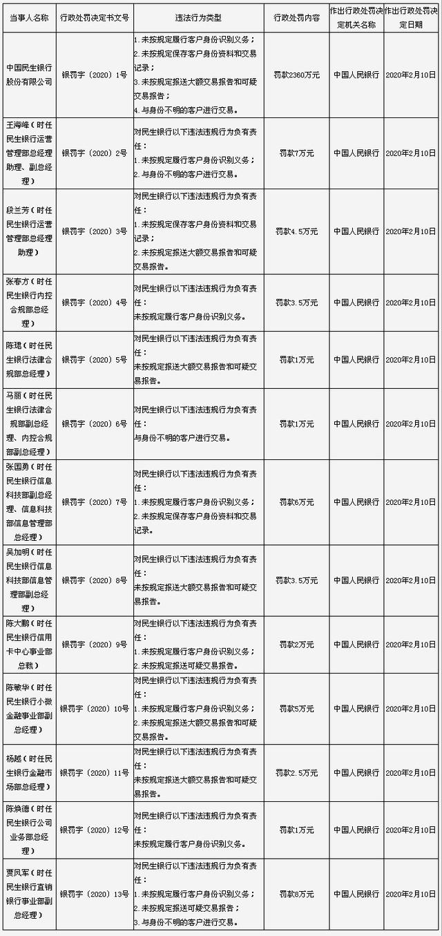 央行2月14日公布的行政处罚决定书(银罚字【2020】1号-13号)显示,中国民生银行股份有限公司因等4项违法违规行为,被罚款2360万元;12名相关责任人亦被处罚,累计罚款45万元。