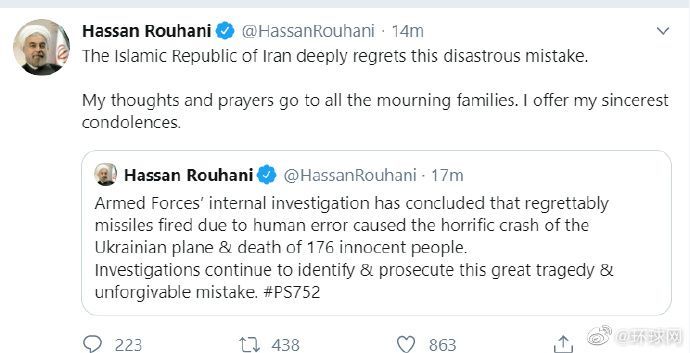 伊朗总统鲁哈发布推特表示,“武装部队的内部调查得出结论,令人遗憾的是,由于人为失误发射的导弹导致乌克兰客机发生了可怕的坠毁并造成176名无辜人员死亡。调查将继续进行,以就这起巨大悲剧和不可原谅的错误进行确认并展开起诉。”