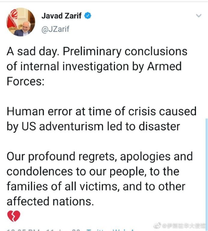 伊朗外长扎里夫在社交媒体发文,对错误击落乌克兰客机表示道歉:悲伤的一天。军方内部调查初步结论:在美国冒险主义诱发的危机时刻,人为失误导致了灾难。对我们的人民、所有受害者家属、及其他受影响的国家,我们致以沉痛悔恨、歉意和哀悼。