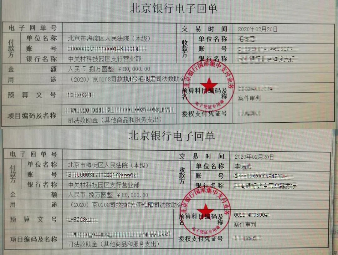 连线完成后,海淀法院当天就根据此次办理的司法救助手续,通过银行汇款的方式为两位申请人发放了救助金,并通过邮寄方式送达救助决定书。