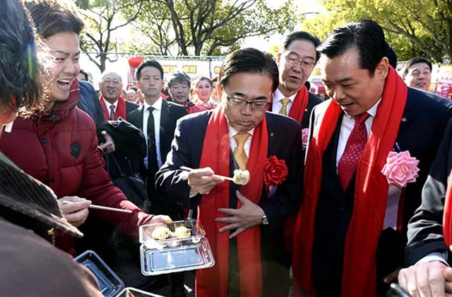 大村知事参观会场,饶有兴致地品尝小笼包。