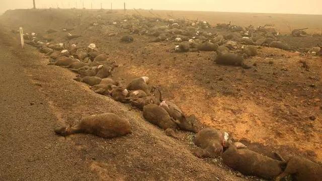 大量的烧焦的袋鼠和牛、羊等牲畜的尸体,躺在道路的两侧
