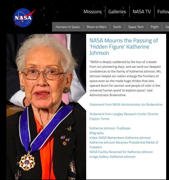 《纽约时报》评价凯瑟琳是“全国最优秀的数学头脑之一”。“约翰逊夫人在美国宇航局工作了33年,几乎没人知道她的名字。她是数百名受到高等教育、能力极强却没能得到相应的赞美的女性缩影。”