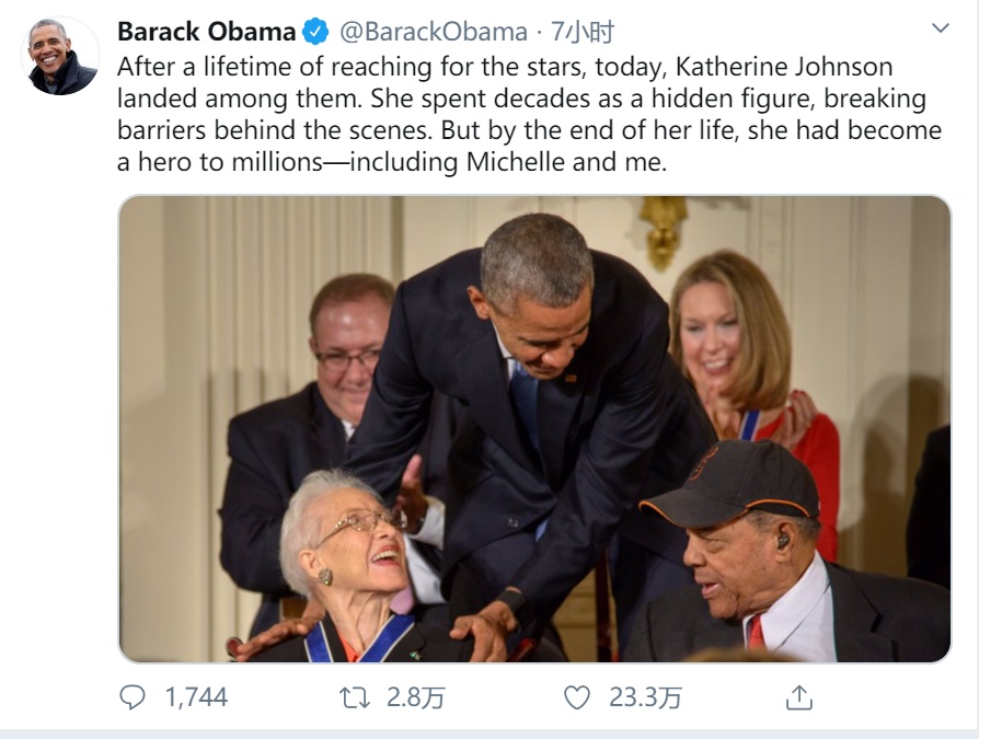 美国前总统奥巴马也在推特上向凯瑟琳致敬:“经过一生的追求,今天,凯瑟琳·约翰逊去世了。她花了数十年时间作为隐藏人物,打破幕后的壁垒。但在生命的尽头,她已成为数百万人的英雄,其中包括我和米歇尔。”