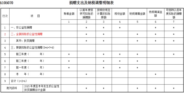 3.《捐赠支出及纳税调整明细表》中,填报“第2行‘全额扣除的公益性捐赠支出’”,填报纳税人发生的可全额税前扣除的公益性捐赠支出,第1列“账载金额”填报纳税人本年发生且已计入本年损益的按税收规定可全额税前扣除的捐赠支出金额。第4列“税收金额”等于第1列“账载金额”。
