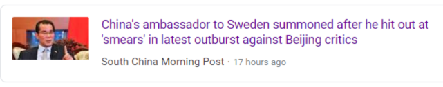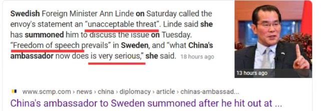 根据香港《南华早报》的报道,瑞典外交部“召见”桂从友大使的原因,居然是认为桂大使批评瑞典媒体的言论是对瑞典和瑞典“言论自由”的“严重威胁”。