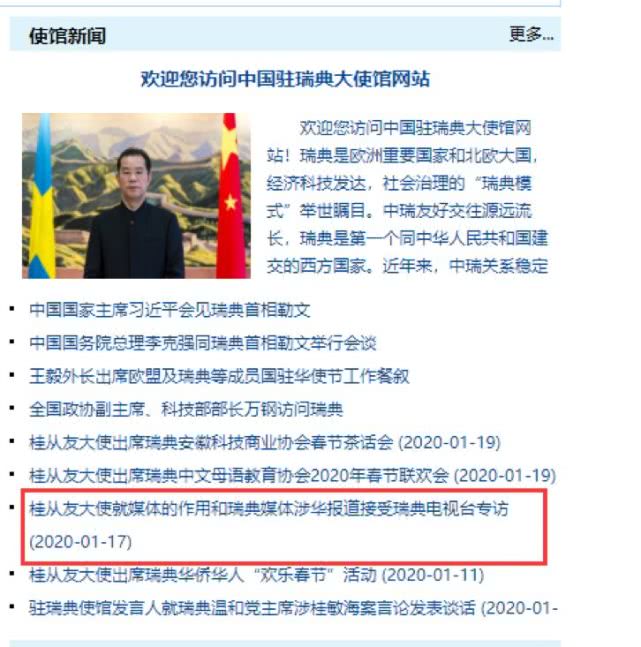 中国驻瑞典大使馆已于2020年1月17日在其官网上已经发布了桂大使那次接受瑞典电视采访的采访全文。其中,瑞典电视台的记者曾提问桂大使说:“我与不少瑞典主流媒体的编辑记者交流过,他们批评中国使馆试图影响他们对华报道的方式。您对此有何评论?”