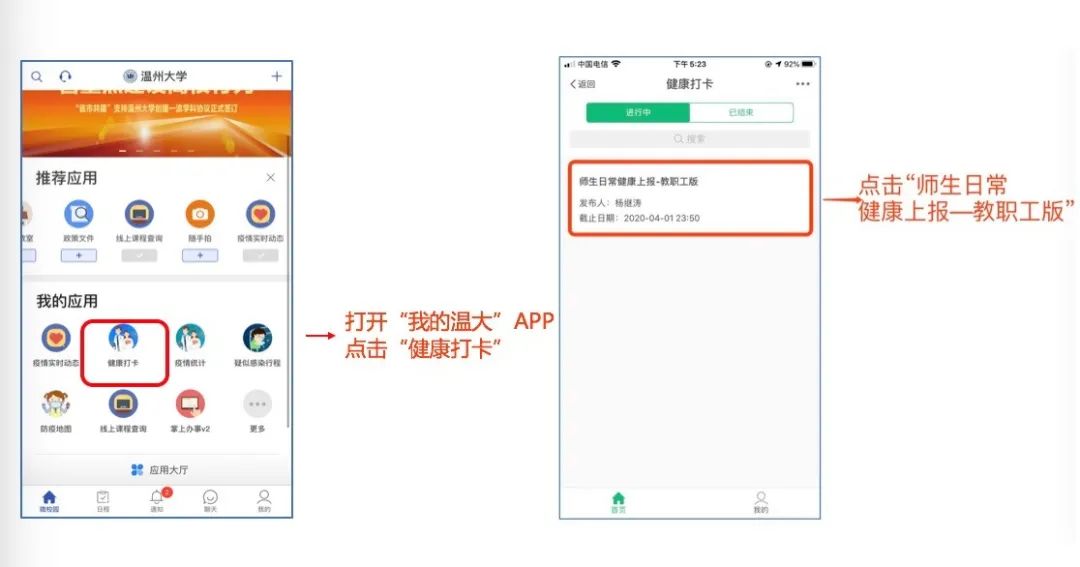 1.根据每日报送要求,锐捷将“健康打卡”整合到“我的温大”APP 中,避免了师生在手机终端再次安装程序,多应用、多账户、多入口的烦恼,争取上线时间。