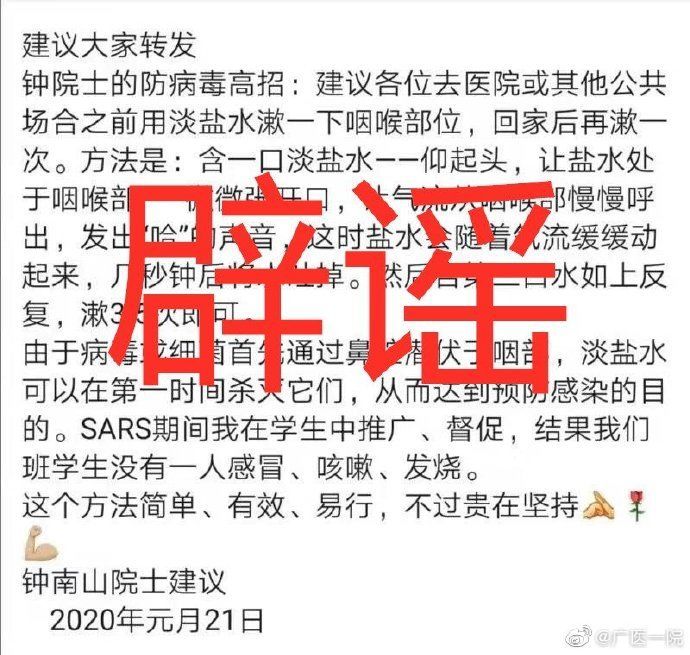 钟南山院士建议用盐水漱口防病毒?谣言!