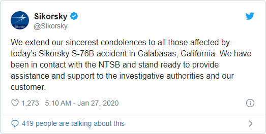 《每日经济新闻》记者还注意到,Sikorsky是美国航空航天制造厂商洛克希德·马丁 (Lockheed Martin)的一个子公司。Sikorsky事后在其官方推特上表示:“我们向今天在加利福尼亚州卡拉巴萨斯发生的西科斯基S-76B飞机事故的所有遇难者表示最诚挚的哀悼。我们一直在与NTSB保持联系,并随时准备为调查当局和我们的客户提供协助和支持。”
