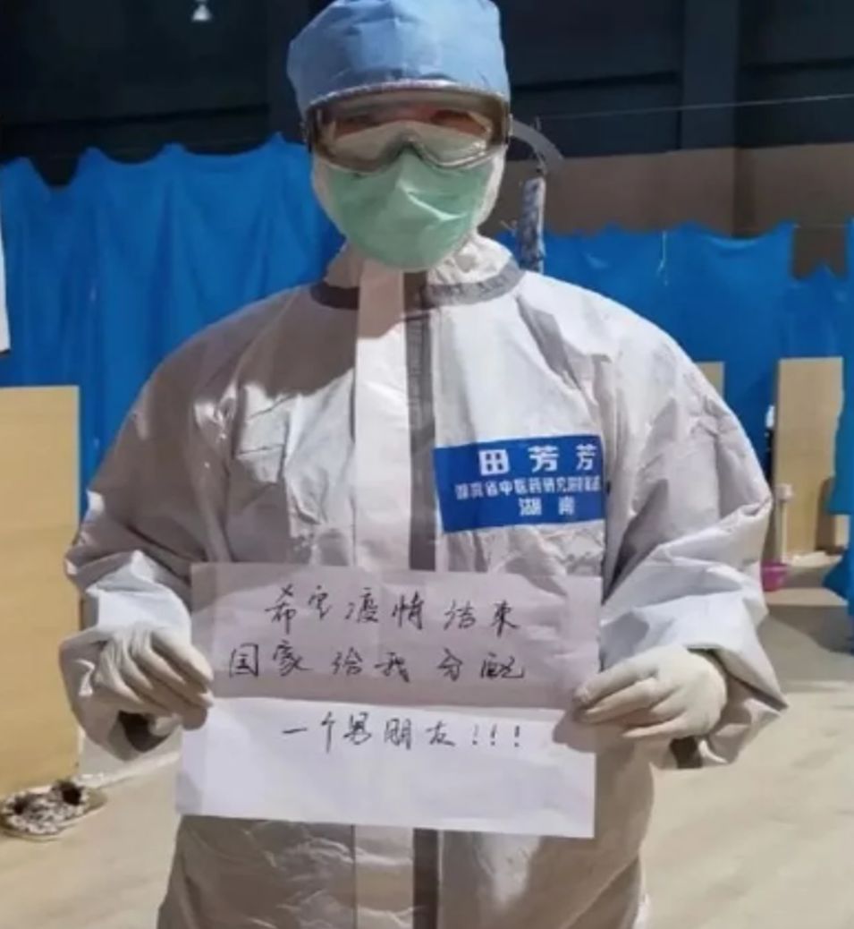 近日,一则湘妹子“求爱”的消息走红网络,并引起了全国网民的强烈反响。事情的经过大致是这样的:正在武汉方舱医院执行抗击新冠肺炎疫情任务,来自湖南中医药研究院附属医院的护士田芳芳与同事们为舒缓工作压力,相约在纸上写下自己的心愿。性格开朗,单身,且正值青春年华的田芳芳便风趣地在纸上写下了“希望疫情结束,国家给我分配一个男朋友!!!”。