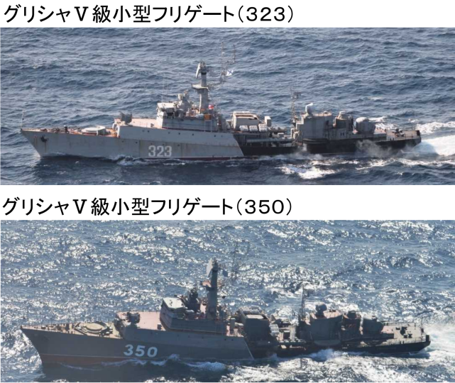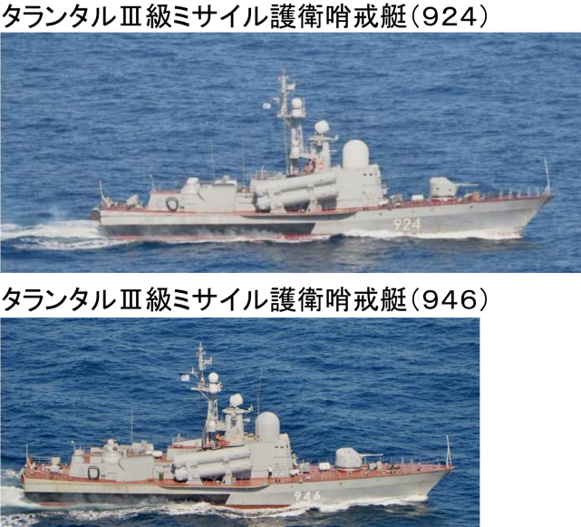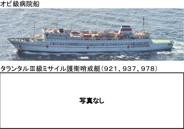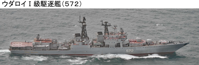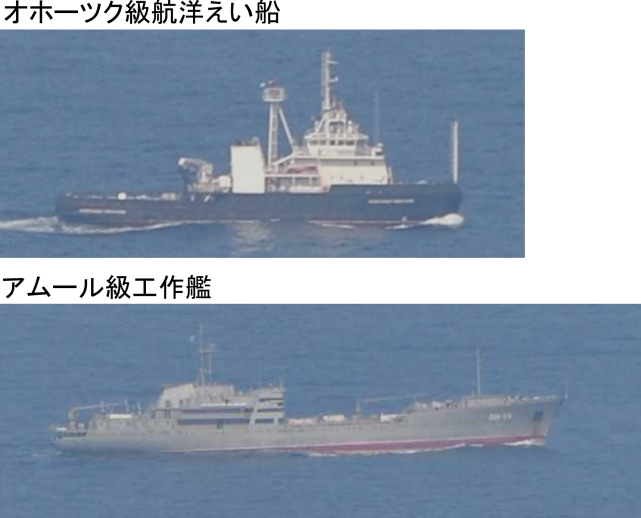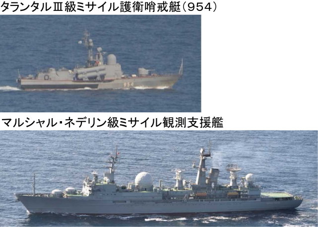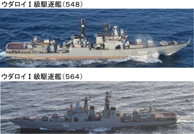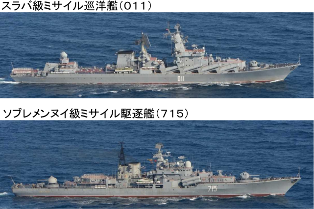 同一天晚上8时许,日本海上自卫队横须贺基地第1护卫队所属驱逐舰“村雨”号和鹿屋基地第1航空群所属P-3C海上巡逻机在对马海峡西南约200千米处海域发现向东北航行的俄罗斯海军2艘军舰,分别为1艘为“无畏I”级驱逐舰和1艘补给舰。随后,这两艘军舰穿越对马海峡继续向东北方前进,向日本海方向航行而去。