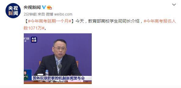 【#今年高考延期一个月#】今天,教育部高校学生司司长介绍,#今年高考报名人数1071万#。