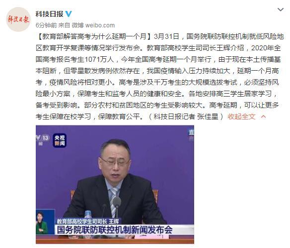 另据科技日报消息:3月31日,国务院联防联控机制就低风险地区教育开学复课等情况举行发布会。教育部高校学生司司长王辉介绍,2020年全国高考报名考生1071万人,今年全国高考延期一个月举行,由于现在本土传播基本阻断,但零星散发病例依然存在,我国疫情输入压力持续加大,延期一个月高考,疫情风险将相对更小。高考是涉及千万考生的大规模选拔考试,必须坚持风险最小方案,保障考生和监考人员的健康和安全。各地安排高三学生居家学习,备考受到影响。部分农村和贫困地区的考生受影响较大。高考延期,可以让更多考生保障在校学习,保障教育公平。(科技日报记者 张佳星)