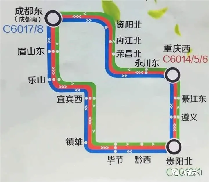 开行贵阳北至贵阳北环线动车C6012次,列车呈逆时针方向经由渝贵铁路、成渝高铁、成贵高铁运行,贵阳北站10:50发车,依次经停遵义、綦江东、重庆西、永川东、荣昌北、成都南、眉山东、乐山、宜宾西、毕节、黔西等11站,18:42抵达贵阳北,全程历时7小时52分。