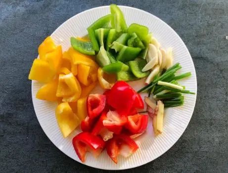 第三步,彩椒摘去根蒂后清洗干净,然后切成块,小米辣摘去根蒂后清洗干净,然后切成圈,大葱取葱白切成片,生姜切成碎,再按照个人的喜好准备其他的蔬菜,将其分别处理好;
