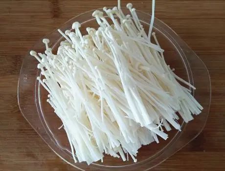 第二步,注意在鱼的内外都需要涂抹均匀,然后在加上点老姜,静置腌制一会,在腌制鱼的过程中,可以来处理蔬菜了,金针菇准备适量,切去根部后,将金针菇清洗干净,控干其中的水分;
