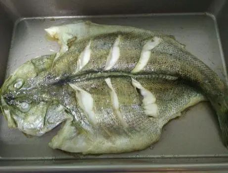 制作过程:第一步,首先准备出一条鲈鱼,将其淘洗干净,然后控干其中的水分,将鲈鱼从肚子里沿着脊骨将背上的肉切开一部分,以此可以让鲈鱼平铺,处理好鲈鱼后,在上面涂抹上食盐和料酒;