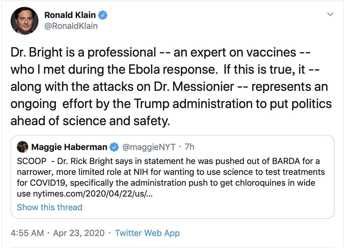 曾领导美国政府2014年埃博拉疫情应对的罗纳德·克莱恩在社交媒体上支持布莱特:“布莱特博士是疫苗方面的专家,如果这(布莱特被调职的原因)是真的,说明特朗普政府一直致力于将政治凌驾于科学和安全之上。”