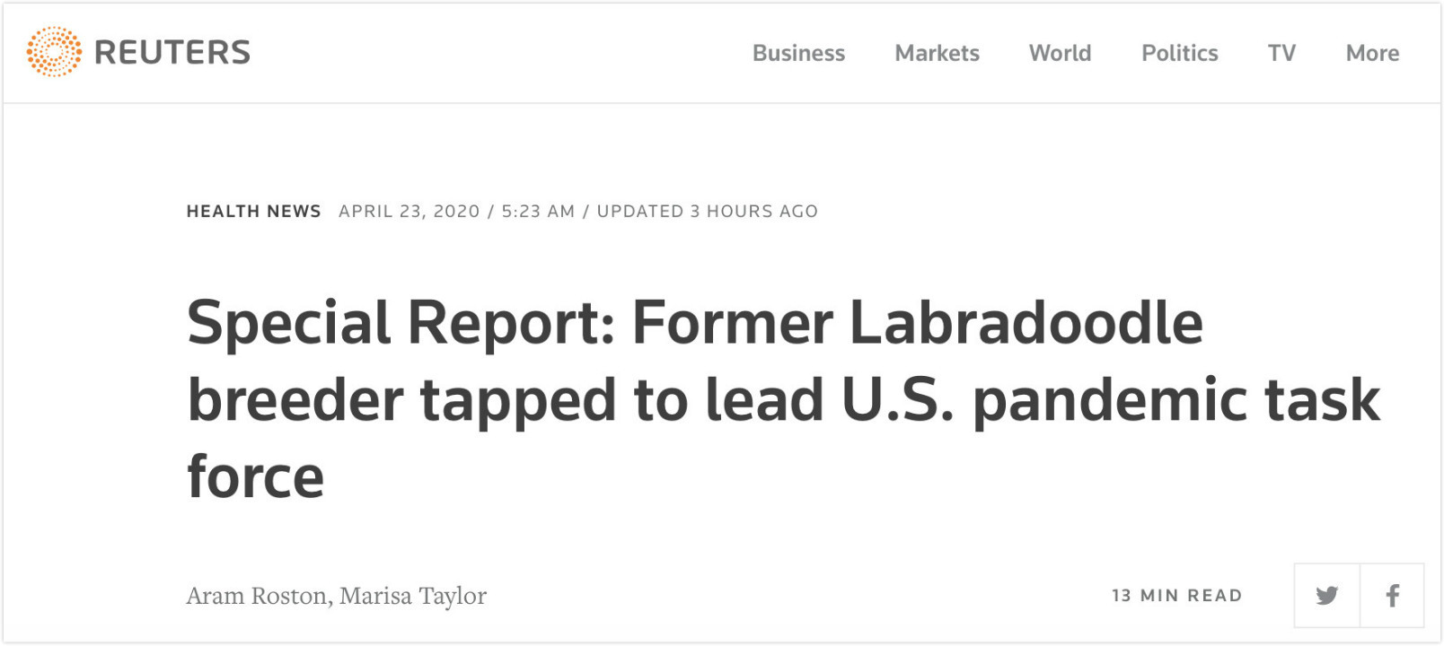 37岁的哈里森没有接受过公共卫生、管理或医学方面的正规教育,只有有限的相关经验。卫生与公众服务部的官方资料显示,哈里森于2018年1月进入特朗普政府任职前,在得克萨斯州“经营一家小公司”。哈里森的个人财务表显示,在2012年至2018年期间,他经营一家售卖澳大利亚拉布拉多猎犬的公司。