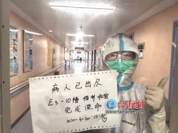 空荡荡的病区走廊上,一名护士穿着厚厚的防护服,面对着镜头竖起了左手大拇指,在她的右手边,一张白色的病例纸上写了几行字:“病人已出尽,E3-10楼顺利收官,完成使命。”