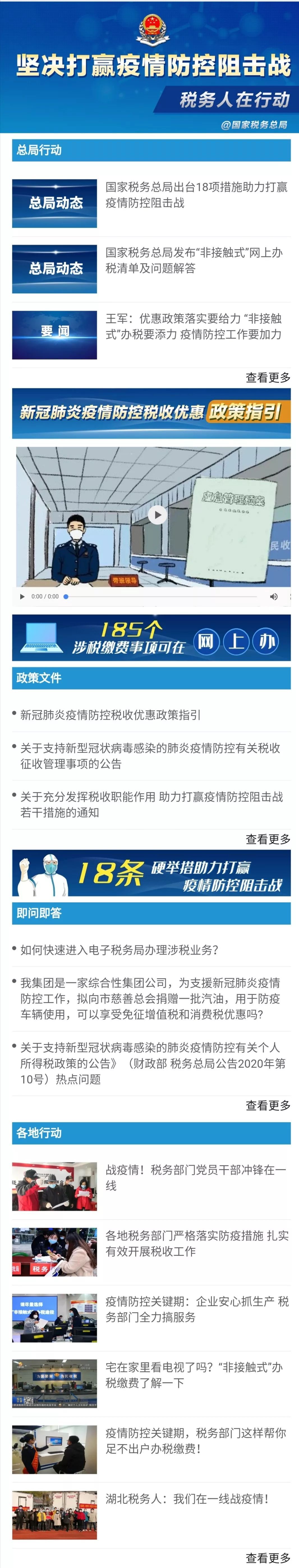 此外,大家通过专题还可以查询到“新冠肺炎疫情防控税收优惠政策指引”“可在网上办理的185个涉税缴费事项”等内容。