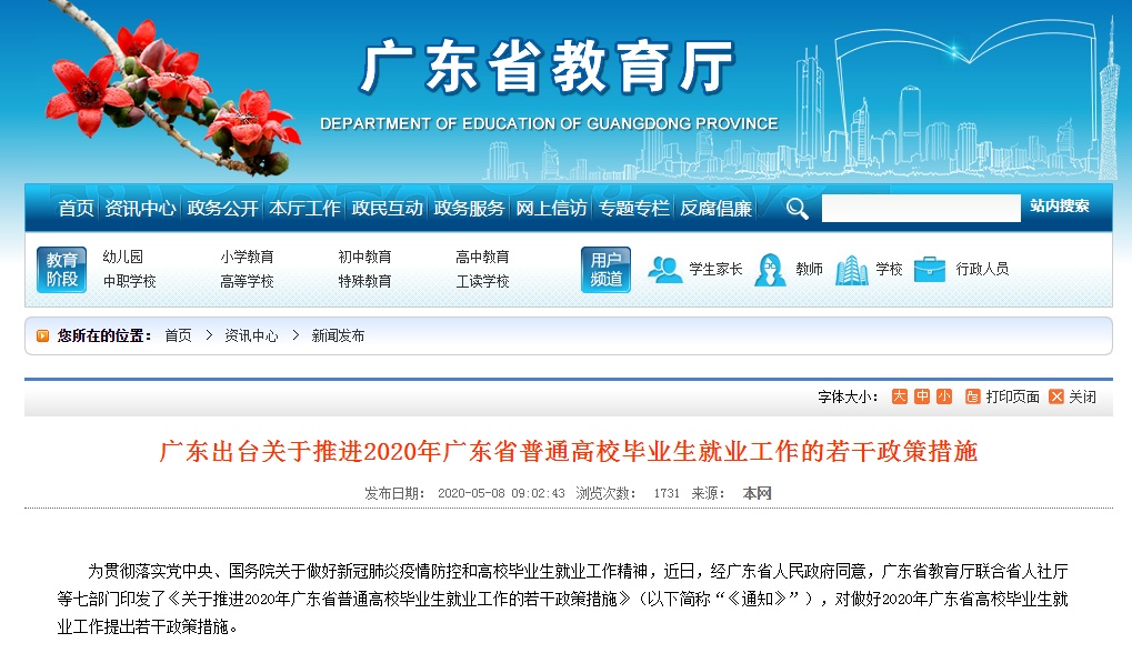5月7日,广东省教育厅等七部门发布《关于推进2020年广东省普通高校毕业生就业工作若干政策措施》,从八个方面出台措施推进高校毕业生就业。