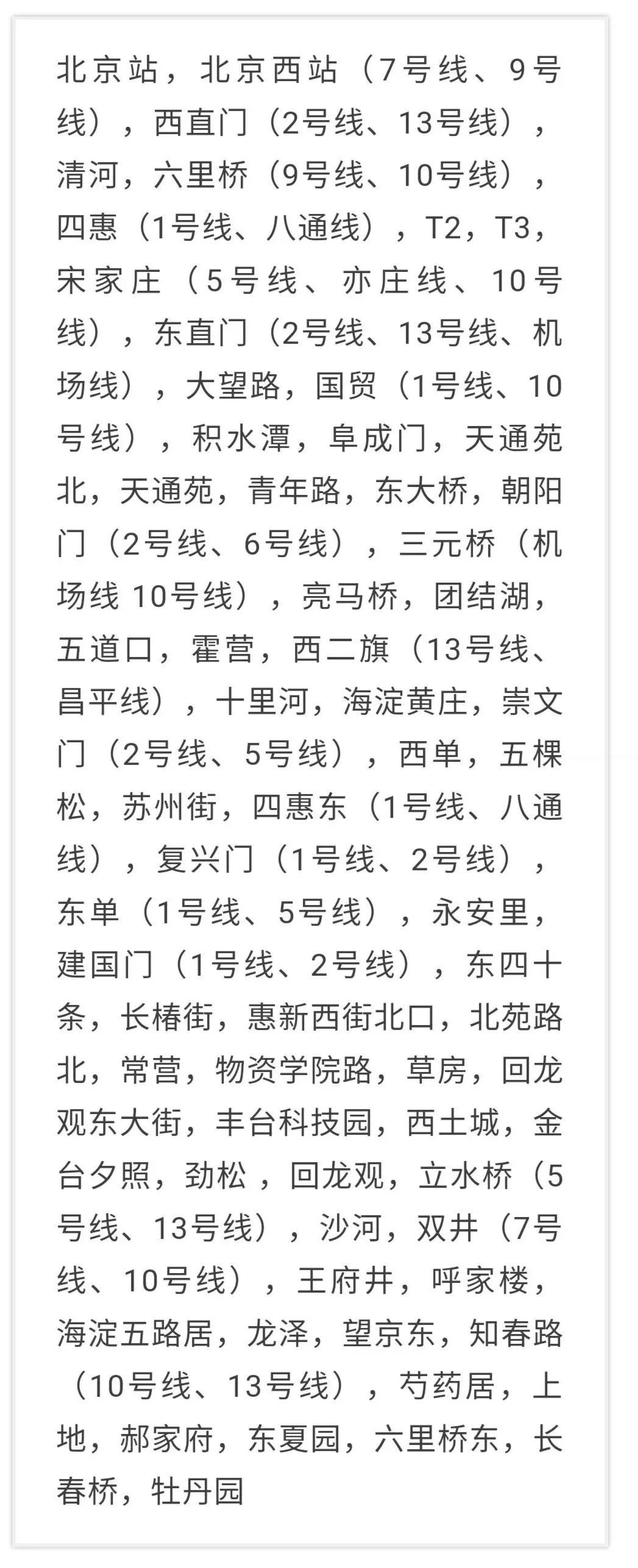 通州北关,北运河西,八宝山,角门东,百子湾,南礼士路,太阳宫,昌平,立水桥南,土桥,健德门,后沙峪,惠新西街南口,木樨地,永泰庄,首经贸,十里堡,玉泉路,育新,西钓鱼台,北苑