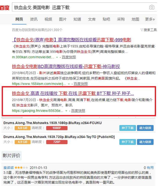 由于影片拍摄时间较早,片源比较难寻,所以在这里给大家指路指的明晰一点,百度“铁血金戈 美国电影 迅雷下载”然后点击页面内的上数第三个链接就可以下载了。