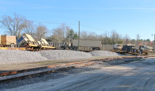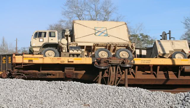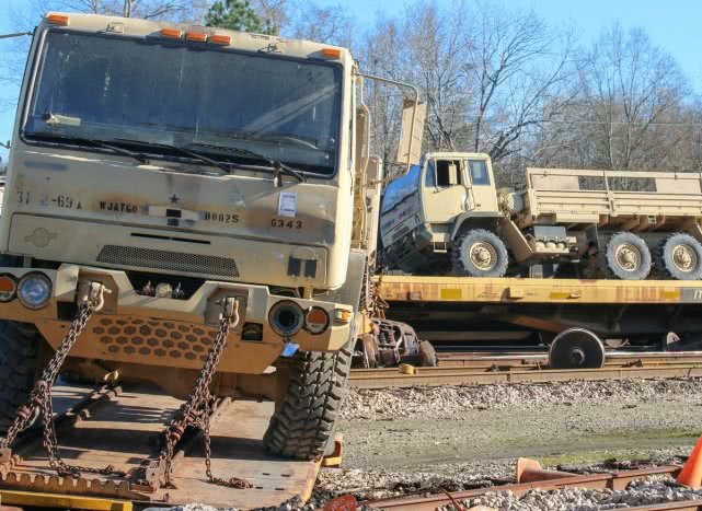 根据现场照片,这一列车携带了M113系列装甲车、替代现有悍马车的JLTV多用途车辆,以及多种不同吨位的军用卡车。