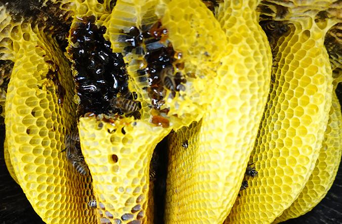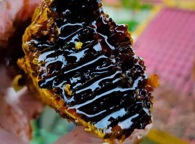 纯正的米团花黑蜜颜色黑如墨汁,黏稠细腻,从蜂巢里取出的时候就是黑色的。