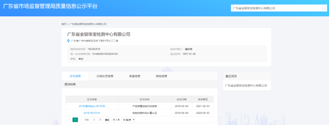 而在广东省市场监管局官网上,我们可以查到广东省金银珠宝检测中心有限公司确实是存在且具备资质的。