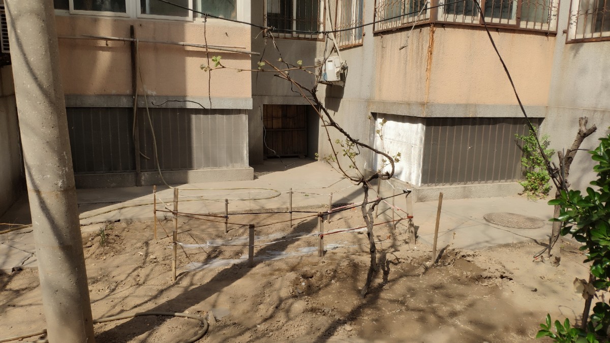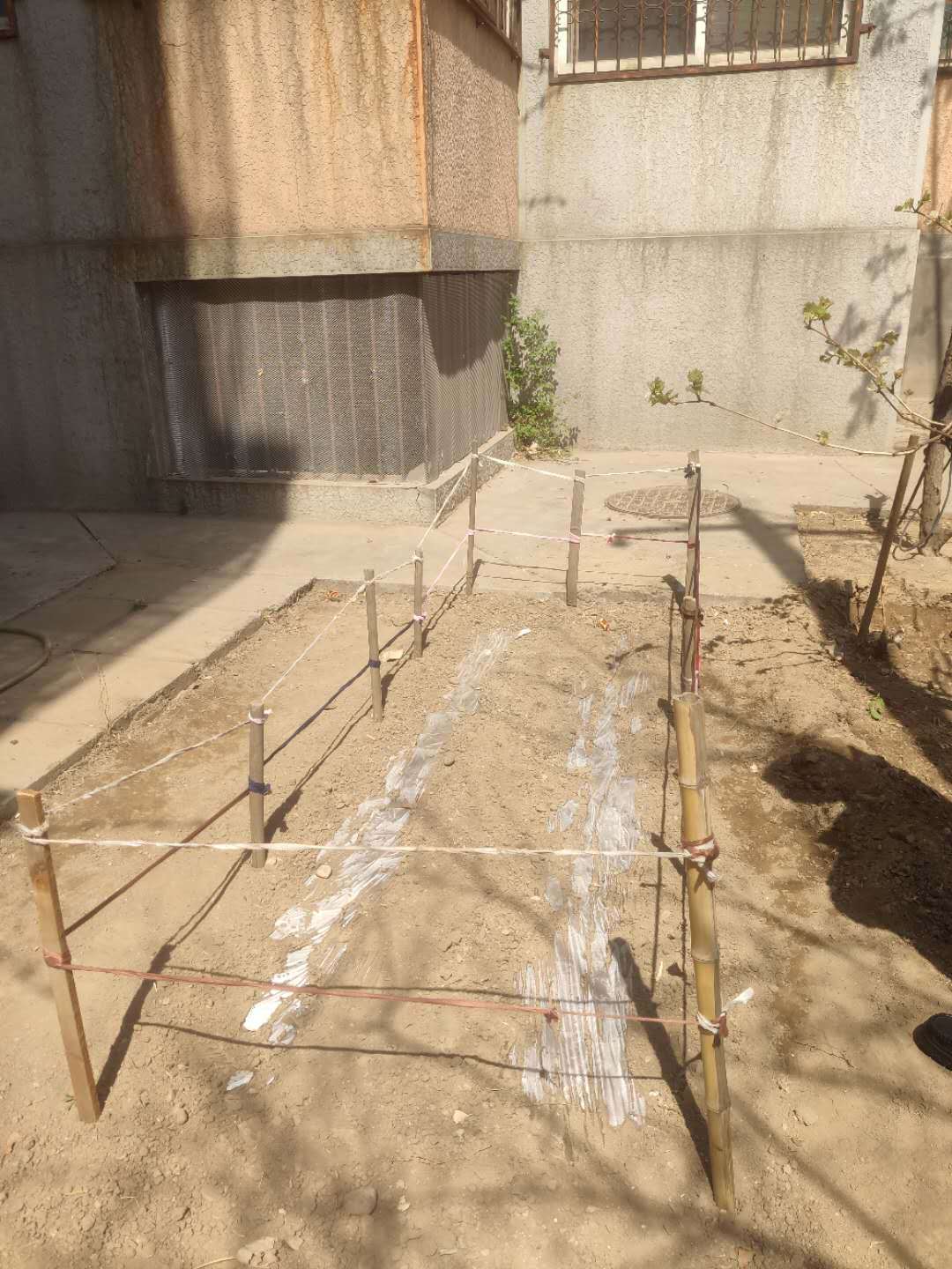 几株小小的葡萄藤刚发出嫩绿的叶子,为了吊蔓,其中一株被铁丝固定在一根黑线上。在这片土地内侧,划出了一片长约2米、宽约1米的区域,地上覆盖着两排塑料地膜,为防止被居民踩踏,种菜的居民还用树枝和白线围挡起一片栅栏。