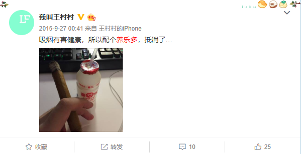 2015年9月,王村村发了一条普普通通的微博,写着“吸烟有害健康,所以配个养乐多,抵消了”。