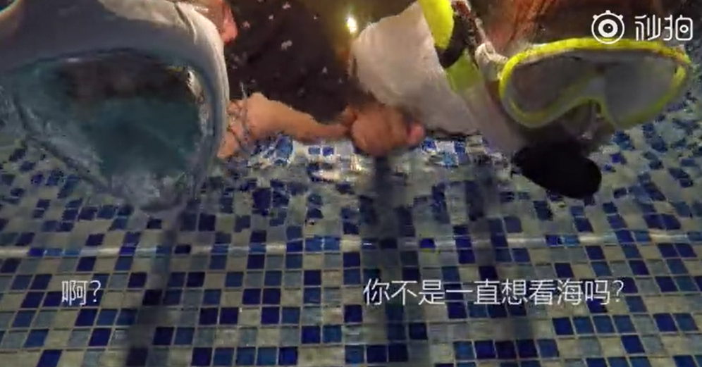 王村村戴上潜水镜,心满意足地下了水——甚至还叫来朋友老郑跟他一起畅游“家里蹲牌马尔代夫”。