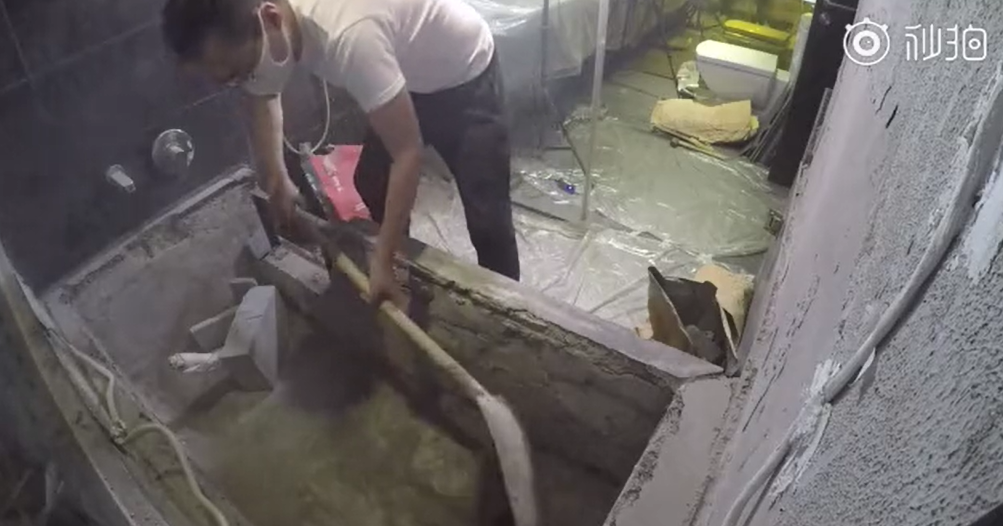 他开始用电钻在墙上钻孔,用大锤砸开墙面留出空间,还买来水泥加固,用瓷砖给游泳池“上色”。