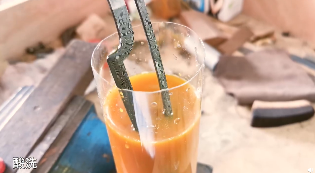 从线切割开始,用电火花工具把鱼刀慢慢“切出来”,经历了退火、打磨、淬火的一系列流程,再把鱼刀浸入装有柠檬汁的杯子里酸洗一番,就可以开刃了。
