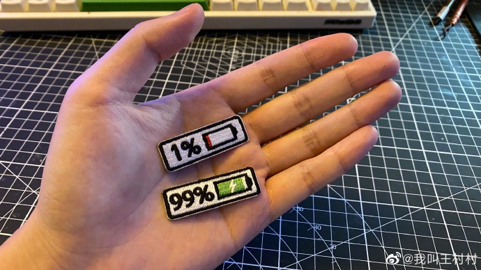 他还买来两个“电量标识”,说可以贴在T恤上,这样就感觉自己是太阳能。