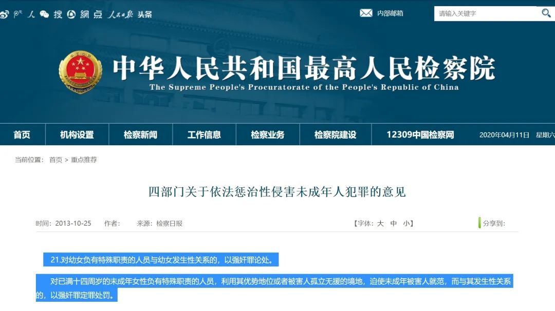 最近,一位公司高管涉嫌性侵未成年“养女”案件受到社会广泛关注。最初两天,大家表达了很多愤怒,我也在4月10日以《对总裁涉嫌性侵“养女”三年案件的9个疑问》为题在单位微信公号上发表了一篇文章。4月11日,我在单位微信公号上发表了另外一篇文章《一条被遗忘的司法规定:“养父”与年满14岁女孩发生性关系是否构成犯罪?》。