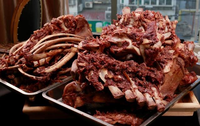 挑选好整驴现场粗加工之后,驴肉会由冷藏车直接送到店里,“因为是现场宰杀,不管是驴肉、驴架子、驴三宝统统都有,而且价格非常实惠”。店里有专门负责驴肉的厨师,经过检验、烧毛、清洗、切块等一番调理,“咕咚咕咚”整盘驴肉倒入定制的老汤锅中,里面加入了花椒、大料、肉蔻等十几种调料,连煮带焖,驴脖子等难熟的部分放在下面,肋条等好熟的部分放在上面,大火烧开,不消一会肉香飘出,转小火再慢煮两个小时左右,“驴肉煮熟之后,关火,不要着急捞出,老汤表面会形成一层油脂锁住热量,静静焖制4小时,等待驴肉与老汤充分融合后再出锅,肉香混着热气,勾人馋虫”。