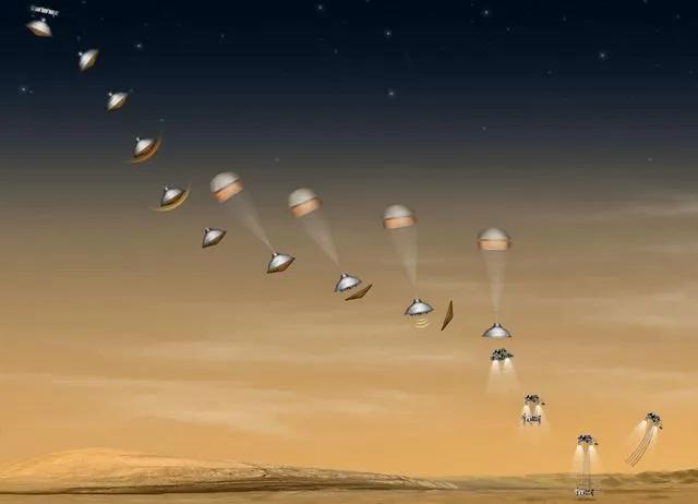 为了实现火星车软着陆,人们使出浑身解数,采用包括气动减速、降落伞减速和反推减速等多种减速手段。
